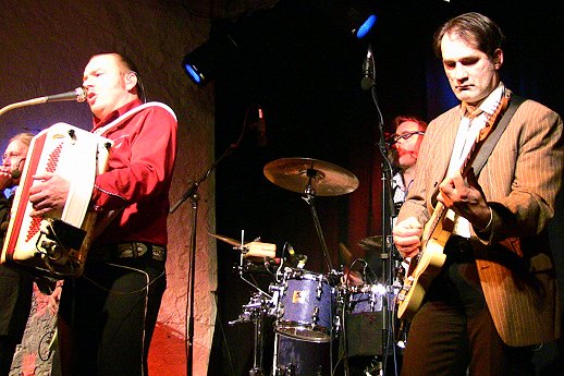 Stefan Hiss am Akkordeon und Mikrofon gab den Ton an. Folk, Blues, Tango, Swing und Ska waren die Stilelemente, die er mit seiner Band auf der Bühne wild variierte. Dazu gab es bisweilen deftige Texte über Liebe, Leid und Laster. Die Gäste genossen die Musik ebenso wie Hiss' markige Ansagen dazwischen und ließen die Musiker um den Tasten-Desperado nicht ohne Zugabe von dannen ziehen.