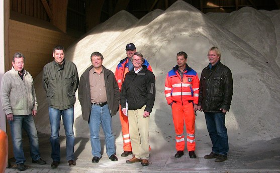 Der Winter im Odenwald kann kommen Werner Riesinger, Jochen Vogel, Arno Krämer vom ASV, Michael Baranyai, Volker Weyrauch, Jürgen Rüting und Harald Körner vor der neuen Salzhalle (v.li.). (Foto: Claudia Richter) (cr) Zu einem Informationsgespräch lud heute das Amt für Straßen - und Verkehrswesen Bensheim (ASV) nach Beerfelden ein. Fazit: Die Straßenmeistereien im südlichen Odenwald sind gut auf Schnee und Eis vorbereitet.