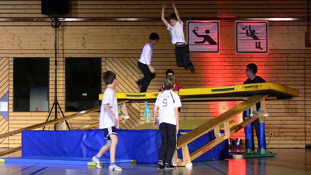 Nach der Begrüßung durch Vorstandsmitglied Janek Lange übernahm seine Vorstandskollegin Gisela Fleck zusammen mit Toni Dausch die Moderation des Programms. Den Anfang machten die Kinder der allgemeinen Turngruppen, gefolgt von der ersten Jazztanzeinlage der Gruppe "New Fellaz". Dann waren die Kleinsten vom Zwergen-, Kleinkinder- und Eltern-Kind-Turnen an der Reihe. Die Leichtathleten zeigten eine rasante Staffel und ein Ballspiel. Ganz bunt kamen die Kids Basketballabteilung daher und gingen auf Korbjagd. Die Judokas präsentierten Fallübungen und Wurftechniken, bevor sich die jungen Gerätturner der Fördergruppe auf dem großen Trampolin sogar an den doppelten Salto wagten.