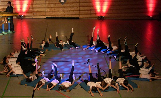 Nach der Pause, in der die TVE-Helfer für Bewirtung und ein reichhaltiges Kuchenbuffet sorgten, setzten die Mädchen der Fördergruppe im Gerätturnen das Programm fort. Zwei versierte Spieler der Tischtennisabteilung boten schnelle Ballwechsel am grünen Tisch, und die Badminton-Jugend zeigte sich als "aufgeweckte Schlafmützen". Jazztanz gab es dann von den "Dancing Flames", bevor die recht neue "Rope Skipping"-Gruppe Artistik mit Sprungseilen präsentierte. Auf den Höhepunkt steuerte die Schau zu, als orientalisch gekleidete junge Damen der Turn-Fördergruppe die Zuschauer mit ausgefeilter Choreografie und turnerisch-artistischem Können nach "Bollywood" entführten. Es folgte noch ein flotter Tanz-Auftritt der "Step Machine", bevor sich alle noch einmal zum großen Finale in der Halle zeigten und das runde Spektakel nach zweieinhalb Stunden mit viel Applaus zu Ende ging.
