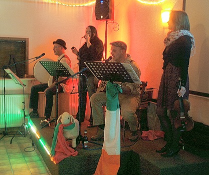 Irischer Abend beim VfB Eberbach (Foto: privat)(bro) (mm) Die "Heebie-Jeebies" waren bisher ein Musikertrio bestehend aus Tina Czemmel-Zink (Vocals), Michael Pascuzzi (Vocals, Bodhran, Cajon und Percussion) und Martin „Mike“ Müller (Vocals, Gitarre, Harp). Am vergangenen Samstag gab es jedoch im VfB-Vereinsheim eine Überraschung - die Band stand zu viert auf der Bühne.