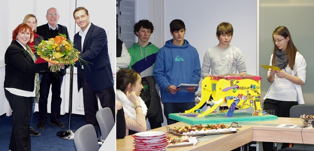 Am 15. November präsentierte das Energieteam der Schule erneut ihre aktuelle Arbeit und geplanten Projekte, und die Klasse 7c brachte ihren selbst entworfenen und selbst gebauten „Elefanten“ mit - ein Ergebnis des Wettbewerbs „Jugend baut“, das in Kooperation mit der Theodor-Frey-Schule in Stuttgart einen ersten Preis gewonnen hat (wir berichteten). Ein Haus der Zukunft in Form eines Elefanten mit bepflanzbarem Dach und Solarzellen auf den Elefantenohren - eine Idee, die auch Burkhard Dinklage (Leiter Operations Europe) und Reinhold Wieth (Leiter Operations Eberbach) gut gefiel. Beide waren auch von den Präsentationen der Schülergruppen begeistert. Anschließend überreichte Burkhard Dinklage der Schulleiterin der Realschule eine Spende für die Schule.
