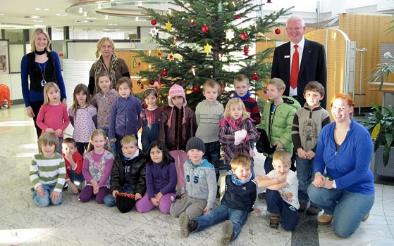Dieses Jahr schmückte der evangelische Kindergarten Arche Noah den Weihnachtsbaum in der Kundenhalle in Eberbach. Die Kindergartenkinder und Erzieherinnen wurden vom stellvertretenden Regionaldirektor, Gerhard Allmann, und Serviceleiterin, Birgit Winterbauer, begrüßt. Mit viel Freude dekorierten die Kinder den Baum mit ihrem selbst gebastelten Christbaumschmuck.