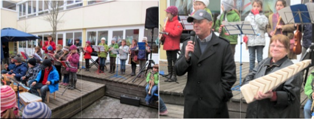 Der "hohe Besuch" aus Heddesbach hatte noch eine Überraschung parat. Von dem erwirtschafteten Geld der Aktion “Unser Dorf hat Zukunft“ überreichte Bürgermeister Klein der Schule 1.000 Euro. Damit kann sie noch ein weiteres Bühnenelement für die mobile Theaterbühne kaufen. Und ganz verbunden zur Natur gab es für die Schulleiterin eine eigens von Bürgermeister Klein aus Fichtenholz geschnitzte Tanne.