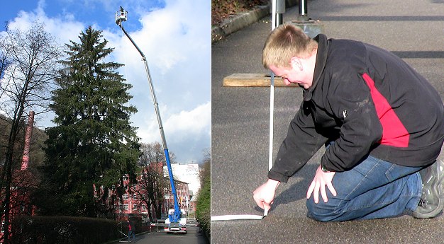 Diese Aufgabe übernahm die Firma Müller Holzbau aus Eberbach, die mit dem Baum bereits vertraut ist, weil sie beim Anbringen der Lampen mitgeholfen hat. Mithilfe eines Kranwagens wurde ein Maßband auf Höhe der Baumspitze angehoben und am Stammfuß durch Geschäftsführer Benjamin Müller persönlich die Höhe abgelesen.