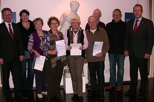 Feriendomizile mit Sternen geschmückt V.l. Bürgermeister Bernhard Martin, Isabell Friedel von der Tourist-Info, die Vermieter Inge Hans, Margret Geier, Ursula Scheuenpflug, Erwin Geisler und Helmut Scheuenpflug, Kulturamtsleiter Tobias Soldner sowie TGO-Geschäftsführer Achim Dörr. (Foto: Claudia Richter)(cr) Eberbacher Ferienwohnungen wurden kürzlich von der Touristikgemeinschaft Odenwald (TGO) klassifiziert. TGO-Geschäftsführer Achim Dörr konnte heute im Rathaus Urkunden an mehrere Vermieter übergeben.