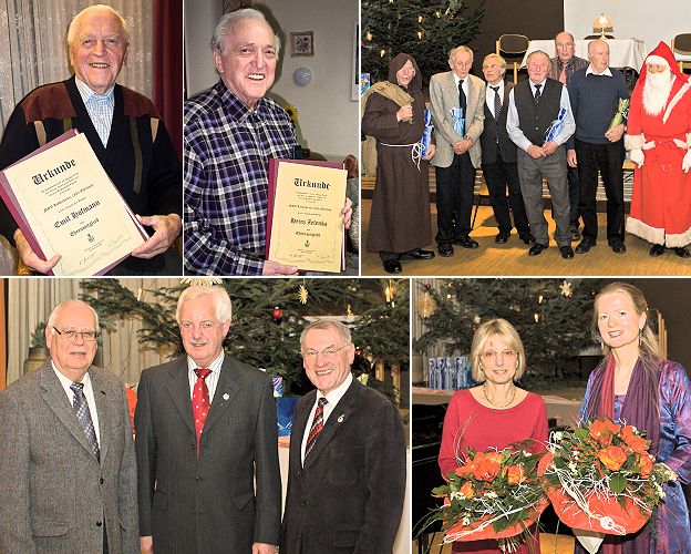 Der MGV Liederkranz hat zwei neue Ehrenmitglieder Links oben: Ehrenmietglied Emil Hofmann. Mitte oben: Ehrenmitglied Heinz-Zelenka. Rechts oben: der Nikolaus und Knecht Ruprecht. Unten links: Die silberne Ehrennadel für 15-jährige Mitgliedschaft erhielten vom Vorsitzenden Eckart Sprenger Dieter Friedel (Mitte) und Günter Stanke (re.). Unten rechts: Ein Blumengruß für Chorleiterin Karin Conrath und Mezzosopranistin Annemarie Quiring. (Fotos: privat)(bro) (ah) Kerzenlicht, weihnachtliche Stimmung, Chorgesang und weitere musikalische Beiträge - diesen feierlichen Rahmen nutzt der MGV Liederkranz Eberbach traditionell für Ehrungen seiner langjährigen Mitglieder. Eine ganz besondere Ehre wurde in diesem Jahr den beiden ehemaligen Sängern Emil Hofmann und Heinz Zelenka zuteil, die sich dem Chor bereits 1951 angeschlossen hatten. Da beide aus gesundheitlichen Gründen nicht am Familienabend teilnehmen konnten, statteten ihnen die MGV-Vorsitzenden Eckart Sprenger und Andreas Held kurzerhand am Vorabend zu Hause einen Besuch ab. Mit der Ernennung zum Ehrenmitglied anlässlich ihrer jeweils 60-jährigen, lange Zeit aktiven Zugehörigkeit zum Chor hatte keiner von beiden gerechnet, sodass die Überraschung wirklich groß war. Für 15-jährige Mitgliedschaft erhielten beim Familienabend Dieter Friedel (aktiv) und Günter Stanke (passiv) jeweils die silberne Ehrennadel des Vereins verliehen.