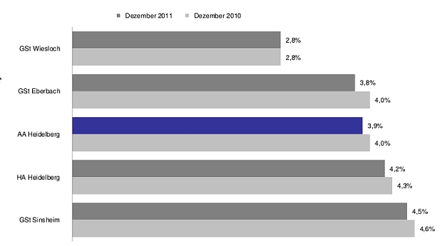 Leichter Anstieg der Arbeitslosigkeit - Entwicklung aber weiterhin günstig Arbeitslosenquoten im Dezember 2011. (Grafik: Bundesagentur für Arbeit)(bro) (aa) Ende Dezember waren im Bezirk der Agentur für Arbeit Heidelberg 8.532 Menschen arbeitslos gemeldet - 112 mehr als im November und 206 weniger als vor einem Jahr. Die Arbeitslosenquote im Gesamtbezirk beträgt weiterhin 3,9 Prozent. Vor einem Jahr waren es 4,0 Prozent.