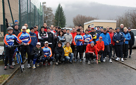 8. Silvesterlauf in Eberbach Auch in diesem Jahr begrüßte Fritz Kaufmann (kniend 1.v.li.) als „Vater” des Eberbacher Silvesterlaufs wieder viele Teilnehmer aus der Region. (Foto: Gerhard Reinmuth)(hof) Bereits zum achten Mal hatten TV Eberbach und VfR Waldkatzenbach zum Silvesterlauf nach Eberbach geladen und 60 Läuferinnen und Läufer waren dieser Einladung gefolgt, um den letzten Tag des Jahres beim längst traditionellen Silvesterlauf ausklingen zu lassen. Die Veranstaltung wurde erneut vom „Vater“ des Silvesterlaufs Mountainbiker Fritz Kaufmann organisiert, der hierfür mit einem Präsent bedacht wurde.