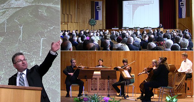 Hier schlägt das Herz des Neckartals Bürgermeister Bernhard Martin sieht Eberbach im Aufwind - links im Bild vor einer Computersimulation von Windkraftanlagen auf dem Hebert. Rechts unten das Ensemble "Pro Organis". (Fotos: Hubert Richter)
