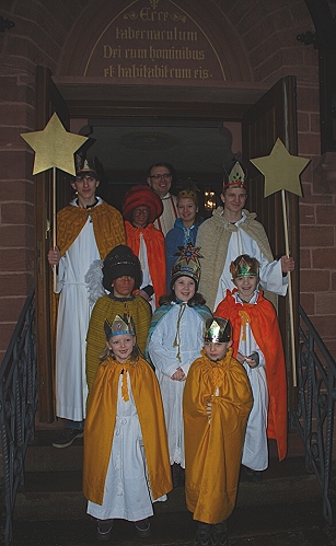 Vergangenen Sonntag zogen die Sternsinger in Friedrichsdorf von Haus zu Haus, sangen Lieder und brachten den Bewohnern den Segen. Im Anschluss erholten sich die müden, aber zufriedenen "Könige" noch bei einer gemeinsamen Stärkung. Sie ersammelten wieder einen stolzen Betrag von über 1000 EURO, der wie die Sammlungen in Eberbach ebenfalls den Kindern der Partnergemeinde in La Concordia zu Gute kommen wird. Das Sternsingerteam unter der Leitung von Christina Münch bedankte sich bei den Kindern und Jugendlichen für ihre Ausdauer und Freude, mit der sie ihre Aufgabe erfüllten und bei den großzügigen Spendern in Friedrichdorf.
