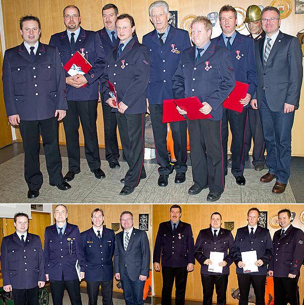 Kurt Wäsch von der Abt. Rockenau (unser Bild unten links, 2. v.l.) für 40 Jahre Mitgliedschaft in der Feuerwehr (Abzeichen in Silber).
