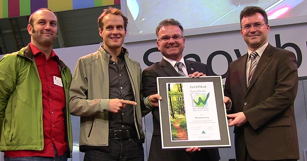 Der Neckarsteig wurde bereits vom Deutschen Wanderverband als "Qualitätsweg wanderbares Deutschland" zeritifiziert. Dessen stellvertretender Geschäftsführer Erik Neumeyer übergab bei der heutigen Präsentation des Wanderwegs auf der CMT in Stuttgart das Zertifikat an Ideengeber Timo Bracht, Eberbachs Bürgermeister Bernhard Martin und Landrat Dr. Achim Brötel vom Neckar-Odenwald-Kreis.