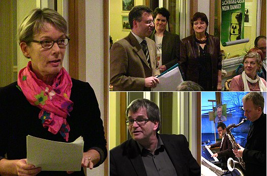 Gut besuchter Odenwaldgipfel am Katzenbuckel Die Eberbacher Landtagsabgeordnete Charlotte Schneidewind-Hartnagel (l.) bei ihrer Ansprache. Oben Landrat Dr. Achim Brötel beim Grußwort mit den Kreisvorsitzenden Christine Böhm und Christine Denz (stehend v.l.), unten Uli Sckerl und das Duo "Zwickschu". (Fotos: Hubert Richter)(hr) Der Kreisverband Neckar-Odenwald von Bündnis90/Die Grünen lud heute Abend zum Neujahrsempfang in Waldbrunn ein. Hauptredner waren die Eberbacher Landtagsabgeordnete Charlotte Schneidewind-Hartnagel und der parlamentarische Geschäftsführer der Landtagsfraktion der Grünen, Uli Sckerl aus Weinheim.