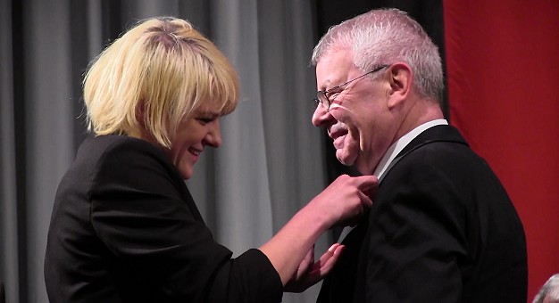 In harten Zeiten das Miteinander stärken - Ehrungen für Bürgerengagement Katharina Korner heftet Hans-Jürgen Waibel die goldene Ehrennadel ans Revers. (Foto: Hubert Richter)Mehr Bilder (Klicken zum Vergrößern):