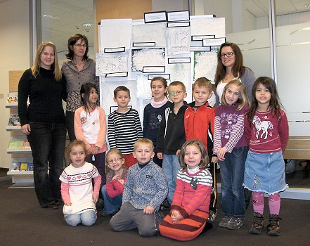 Winterbilder für die Kundenhalle (Foto: privat)(bro) (sch) Wenn der Schnee nicht vom Himmel fällt, dann basteln ihn die Schulanfänger des katholischen Kindergartens St. Elisabeth einfach selbst. Am Dienstag, 24. Januar, brachten die Kinder ihre selbst gestalteten Schneebilder in die Volksbank Neckartal Hauptgeschäftsstelle in Eberbach. Nachdem die Deko an der Stellwand angebracht war, zeigte Jugendberaterin Sabrina Zipse den Kindern die Schließfächer im Tresor der Bank. Dort waren Bastelkalender und Kaleidoskope für jedes Kind versteckt.
