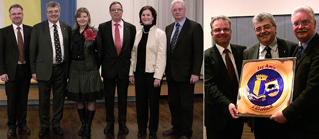Vor 49 Jahren wurde der deutsch-französische Vertrag unterzeichnet Linkes Bild v.l. Bürgermeister Bernhard Martin, Bernard Bondaz, Patricia Favre-Victoire, Michel Pittet, Christine Kley-Guermeur und Helmut Schultz. Rechts Bürgermeister Bernhard Martin mit den Vorsitzenden der Freundschaftsvereine, Bernard Bondaz und Helmut Schultz (v.l.). (Fotos: Claudia Richter)(cr) Am 22. Januar 1963 wurde von den damaligen Staatsoberhäuptern Konrad Adenauer und Charles de Gaulle der deutsch-französische Partnerschaftsvertrag (Elysée-Vertrag) unterzeichnet. In Eberbach wird der "Geburtstag" an diesem Wochenende gemeinsam mit Gästen aus der Partnerstadt Thonon-les-Bains gefeiert.