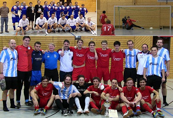 Drei Turniertage in der Hohenstaufenhalle Oben links die beiden Finalisten der Betriebsmannschaften, oben rechts das gestrige Entscheidungstor für den SV Eberbach im Neunmeterschießen, unten die Siegerteams des Seniorenturniers: SV Eberbach (rot) und SpVgg Neckarsteinach. (Fotos:privat/Hubert Richter)(hr) Jubiläum beim SV Eberbach: Zum 25. Mal richtet der Verein an diesem Wochenende das Fußball-Hallenturnier für Betriebe, Seniorenteams und Jugendmannschaften in Eberbach aus.