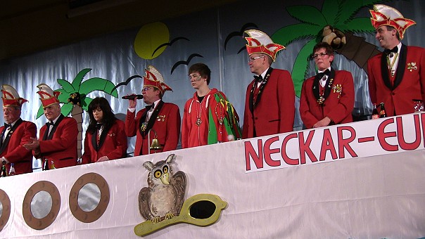 Den zweiten Teil der Sitzung leitete ein nostalgisches Männerballett ein, und Sandra Dietz erzählte in der Bütt einfach über sich selbst. Mit dem überzeugenden Marschtanz der "Eulensterne" und den zu Akkordeonklängen vorgetragenen Baumarkt-Geschichten von Rettungstaucher Johann "Wastl" Bachl folgten zwei viel bejubelte Höhepunkte. "Wastl" durfte erst nach zwei Zugaben von der Bühne gehen. Die Schautanzgruppe "Flames" führte das Publikum in die Steinzeit zurück, und Michael Beisel entzückte in der Bütt mit seinen Erlebnissen als graziles Tanzmariechen. Schließlich legte das närrische Schiff "Neckar-Eule", das in diesem Jahr das Rockenauer Bühnenbild bestimmt, mit einer bunten Schar Akteure auf der Bühne in Richtung Finale ab.