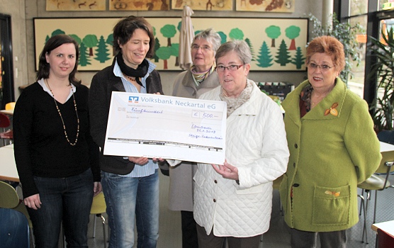 500 Euro für den Mittagstisch Anne Rohde, Doris Mathias und Gertraud Eppler vom Frauenkreis (es fehlt Hildegard Woldrich) mit der Rektorin Ursula Teichtmann (2. v. li.), und der Konrektorin Sabine Beitz (li.). (Foto: privat)(bro) (ut) Der Handarbeitskreis des Steige-Frauenkreises erwirtschaftete beim letzten Adventsbasar 1.885 Euro und spendete kürzlich zum fünften Mal einen Teil des Geldes an den Mittagstisch der Steige-Grundschule, um sozial schwachen Kindern ein warmes Essen zu ermöglichen.
