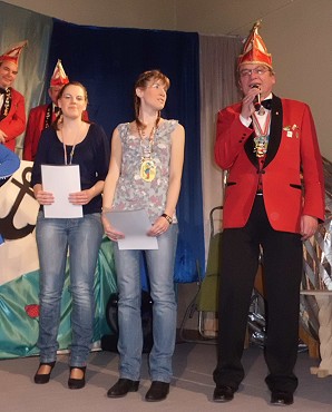 Lachender Eber für zwei Gardetänzerinnen (Foto: privat)(cr) Eine besondere Ehrung gab es am vergangenen Freitag in Rockenau: Bürgermeister Bernhard Martin überreichte in der Festhalle im Rahmen der zweiten Karnevalsitzung des "Club Eulenspiegel" den "Lachenden Eber" an zwei verdiente Fastnachterinnen.