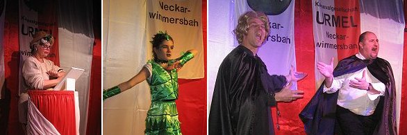 „The Young + The Little Urmels“ (Marilena Messel, Svenja Steck, Carolin Beisel, Dorothee Beisel, Nelly Wettig, Xenia Walter, Samira Schmidt, Jamila Strangfeld) heizten sogleich dem Publikum mit einer flotten Tanzdarbietung ein, und im Anschluss warfen sich Frau Spreisel (Simon Koch) und Frau Brummer (Simone Ulbricht) die Nettigkeiten in Bezug auf ihr Gewicht und ihre Figur gegenseitig zu, wobei „knorrisches Klappergestell“ und „aufgeschwemmtes Krümelmonster“ noch zu den Schmeicheleien gehörten.