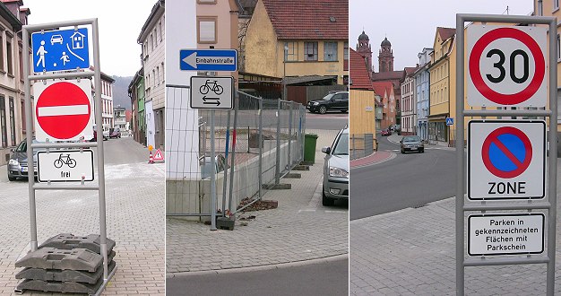 In der Bahnhofstraße, die nun auch das Stück entlang der Michaelskirche umfasst, gilt nicht mehr wie früher Tempo 10. Sie ist jetzt ein "verkehrsberuhigter Bereich", ebenso wie der Neue Markt, die Neckarstraße zwischen Kreisverkehr und Brückenstraße, die Querspange zum Breitensteinweg sowie Teilbereiche der Weiden- und Adolf-Knecht-Straße. In diesen verkehrsberuhigten Bereichen gilt für Fahrzeuge Schrittgeschwindigkeit (4 bis 7 km/h), und alle Verkehrsteilnehmer - auch Radfahrer und Fußgänger, ob Kinder oder Erwachsene - sind gleichberechtigt. Geparkt werden darf auch hier nur innerhalb der dafür gekennzeichneten Flächen. Außerhalb dieser Flächen darf zum Ein- und Aussteigen sowie zum Be - und Entladen gehalten werden. Fußgänger dürfen die Straße in ihrer ganzen Breite benutzen, und Kinder dürfen überall spielen.