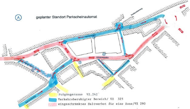 Rainer Menges, Klaus Muff und Michael Erdöffy von der Stadtverwaltung erläuterten heute den Medien gegenüber die Verkehrsbereiche und Beschilderungen, um Unsicherheiten auszuräumen. In der Hauptverkehrsachse Odenwaldstraße und Brückenstraße gilt Tempo 30 und eingeschränktes Halteverbot (unser Bild rechts). Das Parken ist nur auf gekennzeichneten Flächen mit Parkschein erlaubt.