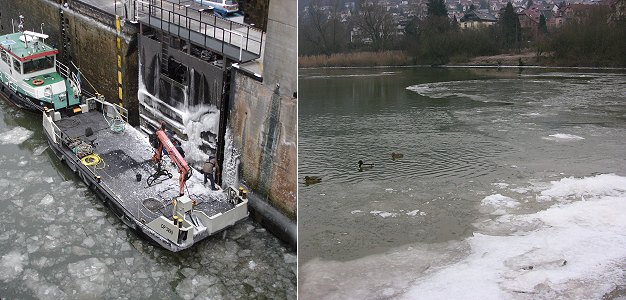 Schifffahrt auf dem unteren Neckar wird immer schwieriger Links die Eisbekämpfung an der Schleuse Rockenau, rechts Eis auf dem Neckar bei Eberbach. (Fotos: WSA / Claudia Richter)(hr) (wsa) Die anhaltende Kälte hat zu einer weiteren Eisbildung auf dem unteren Neckar geführt. Heute wurde wieder den ganzen Tag Eis in den Schifffahrtskanälen und vor den Wehranlagen gebrochen.
