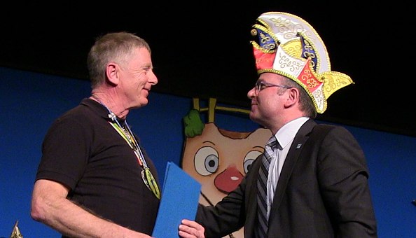Bürgermeister Bernhard Martin nahm die Ehrung im Rahmen der dritten und letzten Prunksitzung der KG Kuckuck in diesem Jahr in der Eberbacher Stadthalle vor. Werner Gerboth steht weniger im Rampenlicht, arbeitet aber hinter den Kulissen kräftig für die Eberbacher Fastnachter. Vor allem durch sein handwerkliches Können und sein technisches Know How ist er für die Kuckucke nahezu unentbehrlich, ob bei den Karnevalveranstaltungen oder auch im weiteren Jahresverlauf, beispielsweise beim Mostzelt auf dem Kuckucksmarkt. Bei den KGK-Sitzungen ist Gerboth unter anderem für die Bühnengestaltung, Requisiten und den Ton zuständig.