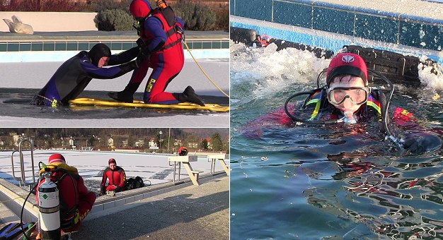 Im Zuge einer Rettungsübung zeigte die DLRG Eberbach gestern im Freibad die richtige Hilf für eingebrochene Personen (unser Bild links oben). Die Lebensretter nutzten auch das vereiste Schwimmbecken für Tauchgänge unter der Eisdecke.
