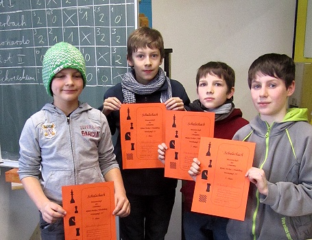 HSG-Schachspieler melden sich eindrucksvoll zurück V.l.: Benedict Jung, Benjamin Helbig, Jonas Hils und Joel Vollweiler. (Foto: privat)