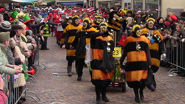 Närrischer Höhepunkt in der Perle des Neckartals Frauenchor Igelsbach als Hummeln, dahinter die Katholische Kirchenmusik Hirschhorn. (Foto: Hubert Richter)Mehr Bilder (Klicken zum Vergrößern):