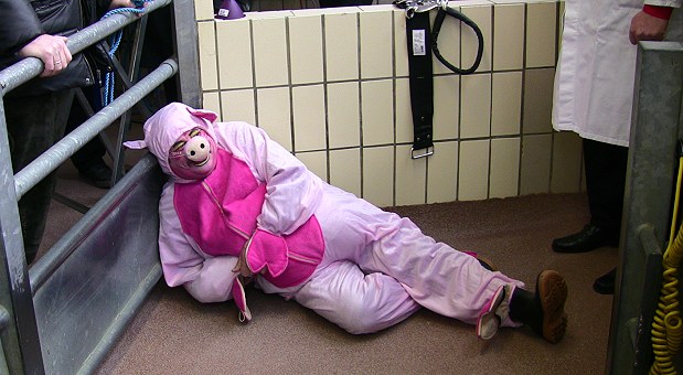 Hilferufe statt Quieken gab das karnevalistische Schwein - im richtigen Leben der Elferrat Lothar Münch - am Vormittag von sich, als es über den Bahnsteg in Richtung Schlachthaus getrieben wurde. Die arme Sau war sich scheinbar ihres Endes bewusst, sollte sie erst einmal in den Händen der Veterinärärzte Müller und Müller (Dirk und Jens Müller) landen. Aber es half kein Quieken und kein Schreien: Die Ranzengarde der KGK fing das "Tier" ein, sperrte es in eine Kiste und schleppte es zum Schlachthof.