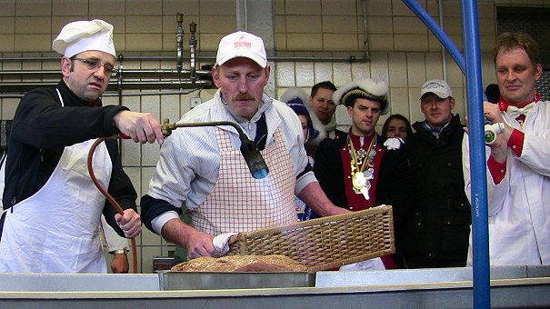 Anlass dieser innerstädtischen Treibjagd war das närrische 99-jährige Jubiläum der Eberbacher Metzgerei Eichhorn, das Chef Roger Sepp fast freiwillig am heutigen Rosenmontag feiern wollte. In seinem Schlachthaus im Neuen Weg waren dann auch sofort Karl-Gustav Schwademage (Ralph Brenneis) und Herr Ützwoscht (Reinhard Wurm) aus dem Bereich Lebensmittelüberwachung vorort. Zum ersten Mal wolle man in EBERbach das Schlachtverfahren nach der neuen EU-Verordnung 1111 austesten, hieß es. Laut Gesetzesvorlage müsse eine Lebendbeschau stattfinden. Bauer Müller (Uwe Wäsch) könne auf sein Odenwälder Prachtexemplar, das per Flaschenfütterung regelmäßig mit Hopfen und Malz ernährt wurde, stolz sein, versicherte Schwademage dem anwesenden fachkundigen Publikum. Kleine Mängel wurden noch im Schlachthaus behoben, wie beispielsweise eine Parasitenbehandlung mit Vogelbeerschnaps, und so konnten dem einst so glücklichen Schwein der Metzger Sepp und sein Geselle Marc Moll zu Leibe rücken. Auch eine Gegendemonstration von gewaltfreien närrischen Aktivisten konnte nicht verhindern, dass die Sau als "Edle Eberbacher Fastnachtswürste" in aller Munde geriet. Nach Eberbach reiste eigens für diese Premiere der Michelin-Sternekoch Claude Porkuse (Klaus Brenneis), um die schweinischen Teile mit einer Prise Humor, einer Messerspitze Taktgefühl und einem Pülverchen für die Standhaftigkeit der Würstchen zu würzen. Nach diversen Geschmacksproben, bei denen auch Mitarbeiterinnen und Mitarbeiter der Stadtverwaltung sowie der Eberbacher Kripochef Friedrich Kocher und der Leiter des Polzeireviers, Erich Lindenthal, testen mussten, konnten Ützwoscht und Schwademage dem Metzgermeister Sepp eine einwandfreie und schmackhafte Ware attestieren.