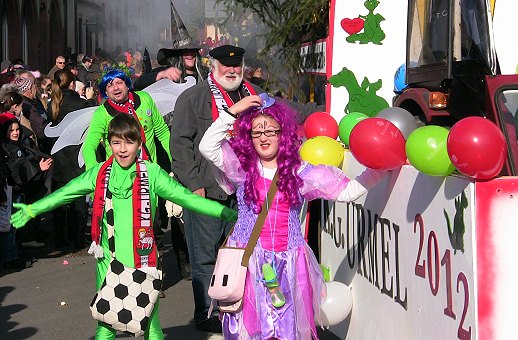 Außer den Kuckucken waren aus Eberbach die KG Urmel und der Club Eulenspiegel mit mehreren Gruppen vertreten, außerdem die Hirschhorner Ritter und die Neckargemünder Karnevalgesellschaft. Neben privaten Gruppen, Kindergärten und Vereinen aus Eberbach kamen Teilnehmer aus Friedrichsdorf/Kailbach, Hirschhorn, Igelsbach, Neckarsteinach und Waldbrunn. Viele Gruppen waren auch aus Sensbachtal gekommen, wo die Fastnacht von den Vereinen TSV und MGV organisiert wird. Wieder einen besonders aufwändig gestalteten Motivwagen, diesmal zum Thema Pippi Langstrumpf, hatten die Karnevalfreunde Haidebow dabei (Bild rechts oben). Damit belegten sie bei der diesjährigen Wagenprämierung in Mudau den ersten Platz. Zweitplatzierte waren die "Wilden aus dem Ittertal", die heute ebenfalls in Eberbach dabei waren und als Gartenzwerge ein buntes Bild abgaben. Fantasievolle Fußgruppen waren unter anderem die "Wimmersbacher Ratze" (Schneewittchen) und die "Rasselbande" (Eskimos).