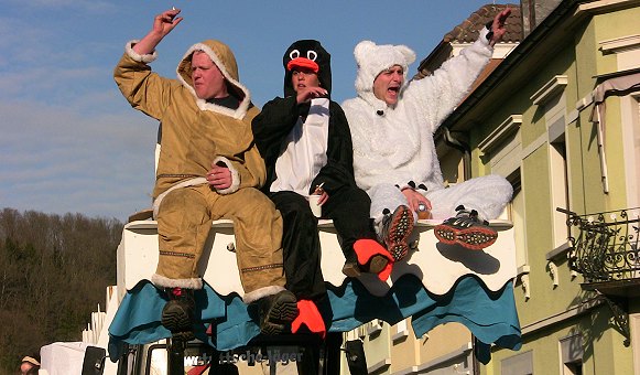 Außer den Kuckucken waren aus Eberbach die KG Urmel und der Club Eulenspiegel mit mehreren Gruppen vertreten, außerdem die Hirschhorner Ritter und die Neckargemünder Karnevalgesellschaft. Neben privaten Gruppen, Kindergärten und Vereinen aus Eberbach kamen Teilnehmer aus Friedrichsdorf/Kailbach, Hirschhorn, Igelsbach, Neckarsteinach und Waldbrunn. Viele Gruppen waren auch aus Sensbachtal gekommen, wo die Fastnacht von den Vereinen TSV und MGV organisiert wird. Wieder einen besonders aufwändig gestalteten Motivwagen, diesmal zum Thema Pippi Langstrumpf, hatten die Karnevalfreunde Haidebow dabei (Bild rechts oben). Damit belegten sie bei der diesjährigen Wagenprämierung in Mudau den ersten Platz. Zweitplatzierte waren die "Wilden aus dem Ittertal", die heute ebenfalls in Eberbach dabei waren und als Gartenzwerge ein buntes Bild abgaben. Fantasievolle Fußgruppen waren unter anderem die "Wimmersbacher Ratze" (Schneewittchen) und die "Rasselbande" (Eskimos).