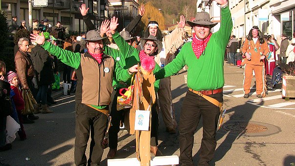 Außer den Kuckucken waren aus Eberbach die KG Urmel und der Club Eulenspiegel mit mehreren Gruppen vertreten, außerdem die Hirschhorner Ritter und die Neckargemünder Karnevalgesellschaft. Neben privaten Gruppen, Kindergärten und Vereinen aus Eberbach kamen Teilnehmer aus Friedrichsdorf/Kailbach, Hirschhorn, Igelsbach, Neckarsteinach und Waldbrunn. Viele Gruppen waren auch aus Sensbachtal gekommen, wo die Fastnacht von den Vereinen TSV und MGV organisiert wird. Wieder einen besonders aufwändig gestalteten Motivwagen, diesmal zum Thema Pippi Langstrumpf, hatten die Karnevalfreunde Haidebow dabei (Bild rechts oben). Damit belegten sie bei der diesjährigen Wagenprämierung in Mudau den ersten Platz. Zweitplatzierte waren die "Wilden aus dem Ittertal", die heute ebenfalls in Eberbach dabei waren und als Gartenzwerge ein buntes Bild abgaben. Fantasievolle Fußgruppen waren unter anderem die "Wimmersbacher Ratze" (Schneewittchen) und die "Rasselbande" (Eskimos).