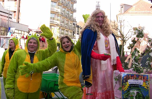 Außer den Kuckucken waren aus Eberbach die KG Urmel und der Club Eulenspiegel mit mehreren Gruppen vertreten, außerdem die Hirschhorner Ritter und die Neckargemünder Karnevalgesellschaft. Neben privaten Gruppen, Kindergärten und Vereinen aus Eberbach kamen Teilnehmer aus Friedrichsdorf/Kailbach, Hirschhorn, Igelsbach, Neckarsteinach und Waldbrunn. Viele Gruppen waren auch aus Sensbachtal gekommen, wo die Fastnacht von den Vereinen TSV und MGV organisiert wird. Wieder einen besonders aufwändig gestalteten Motivwagen, diesmal zum Thema Pippi Langstrumpf, hatten die Karnevalfreunde Haidebow dabei (Bild rechts oben). Damit belegten sie bei der diesjährigen Wagenprämierung in Mudau den ersten Platz. Zweitplatzierte waren die "Wilden aus dem Ittertal", die heute ebenfalls in Eberbach dabei waren und als Gartenzwerge ein buntes Bild abgaben. Fantasievolle Fußgruppen waren unter anderem die "Wimmersbacher Ratze" (Schneewittchen) und die "Rasselbande" (Eskimos).