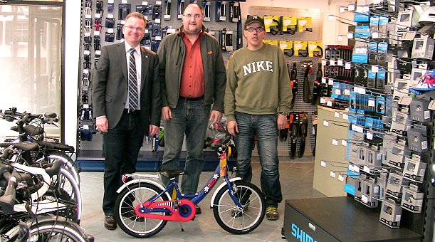 Neueröffnung in der Kellereistraße V.l. Bürgermeister Bernhard Martin, Bernhard Walter vom Kulturamt und Geschäftsinhaber Detlev Fink. (Foto: Claudia Richter)(cr) Pünktlich zum kalendarischen Frühlingsbeginn wurde in der Kellereistraße ein Fahrradgeschäft eröffnet. Inhaber Detlev Fink will neben Beratung und Verkauf auch Reparaturen aller Fahrradtypen anbieten.