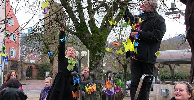 Glück- und Gesundheitswünsche von Eberbach nach Japan (Foto: Hubert Richter)(hr) Ein buntes Bild bieten seit heute Mittag zwei Bäume auf dem Leopoldsplatz in Eberbach: Gefaltete Papiervögel in verschiedenen Farben hängen in ihrem Geäst und symbolisieren das Gedenken an die Erdbebenkatastrophe in Japan vor einem Jahr.
