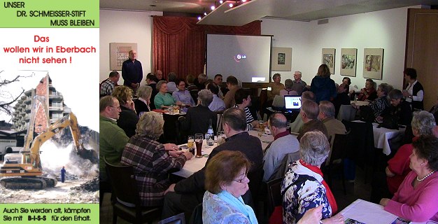 BISS will Zähne zeigen Mit einem plakativen Flyer (links) will man gegen den Abriss mobil machen. Gut 60 Bürgerinnen und Bürger kamen heute zum Infoabend. (Fotos: Hubert Richter)(hr) Den Weg in die Öffentlichkeit sucht jetzt die kürzlich gegründete Bürgerinitiative Dr.-Schmeißer-Stift (BISS). Heute fand ein gut besuchter Infoabend im Restaurant am Leopoldsplatz statt.
