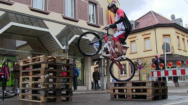 Mit Ostermarkt und Sonntagsshopping in die Bärlauchzeit Radkünstler und Trialfahrer Max Schrom zeigte vor dem Schuhhaus Fritz Karl sein artistisches Können. (Foto: Hubert Richter)Mehr Bilder (Klicken zum Vergrößern):