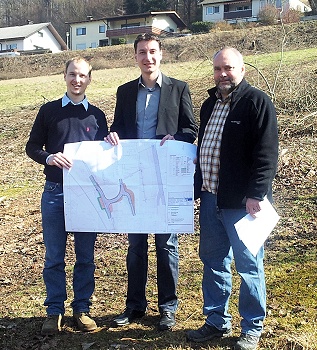 Erschließungsarbeiten des Baugebiets Gertberg II beginnen noch vor Ostern (Foto: privat)(bro) (nl) Nachdem der Gemeinderat der Gemeinde Neckargerach in seiner letzten Sitzung den Auftrag für die Erschließungsarbeiten des Neubaugebietes Gertberg II - Erweiterung vergeben hat, haben sich der betreuende Ingenieur Steffen Leiblein vom Ingenieurbüro IFK Mosbach, der Geschäftsführer der bauausführenden Firma Meny Edwin Fehr und Bürgermeister Norman Link vor Ort zu einer ersten Besprechung eingefunden.