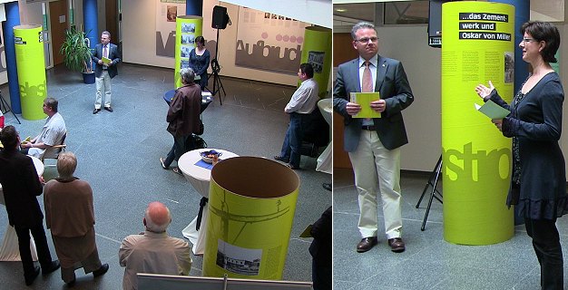 Mit einer Leitung von Lauffen über Eberbach nach Frankfurt fing es an Bis 20. Mai ist die Ausstellung im Rathausfoyer zu sehen. Rechts Eva Ehrenfeld aus Lauffen beim Einführungsvortrag mit Eberbachs Bürgermeister Bernhard Martin. (Fotos: Hubert Richter)(hr) Ein Meilenstein in der Geschichte der Elektrifizierung war die erste Drehstromübertragung von Lauffen am Neckar nach Frankfurt am Main. Diesem Thema ist eine Ausstellung gewidmet, die heute im Foyer des Eberbacher Rathauses eröffnet wurde.