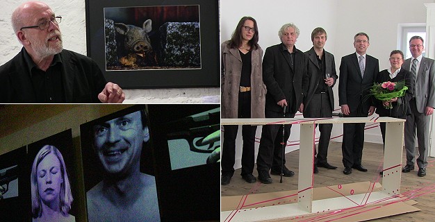 Drei Künstler aus der Region stellen aus Rechts Barbara Hindahl, Fritz Stier und Martin Kemmet mit Landrat Stefan Dallinger, Galeristin Juliane Kehm und Bürgermeister Bernhard Martin (v.l.) an Hindahls Installation "Billy 6". Links oben Prof. Hans Gercke vor der Fotografie "Versteinert" von Martin Kemmet. Unten die Videoinstallation "Bodhi" von Fritz Stier. (Fotos: Hubert Richter)(hr) In der Reihe "Atelier und Künstler" fördert der Rhein-Neckar-Kreis seit 1991 regelmäßig Kunstschaffende aus der Metropolregion mit Ausstellungen und Katalogen. In diesem Frühjahr laufen im Rahmen der 23. Kreiskulturwoche Ausstellungen an fünf Orten im Kreisgebiet. Eine davon wurde heute in Eberbach eröffnet.