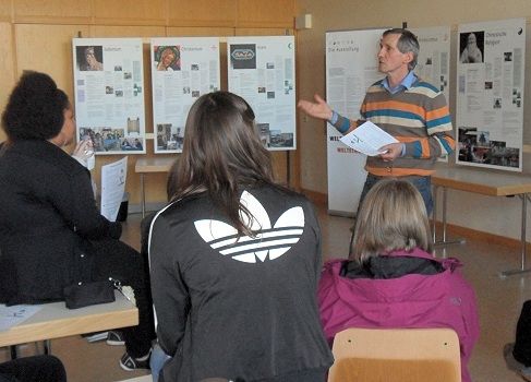 Weltreligionen – Weltfrieden – Weltethos Religionslehrer Helmuth Seifried mit einer Schulklasse in der Ausstellung „Weltfrieden“. (Foto: privat)(bro) (ts/rd) Gibt es so etwas wie ein Kulturen übergreifendes Ethos, ein Weltethos? Zwei Wochen lang waren Schüler und Lehrer der Theodor-Frey-Schule eingeladen, die interessante Welt der verschiedenen Weltreligionen näher kennen zu lernen und eine Antwort auf diese Frage zu finden.