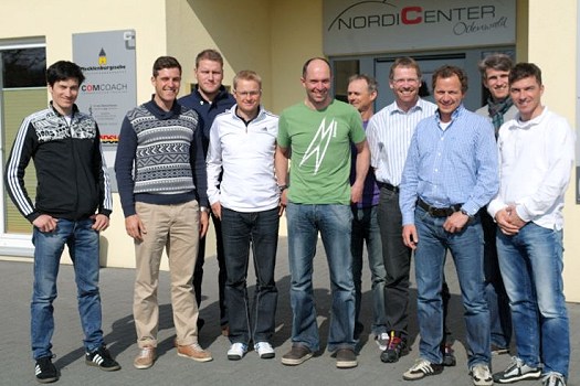 Medienseminar in Beerfelden V.l.: Martin Schmitt, Frank Nitsch, Jörn Wollschläger, Roman Böttcher, Arne Kluge, Marco Frank, Prof. Dr. Ansgar Schwirtz (TU München) Kai Bracht, Marcus Schick (SKom München) Rene Sommerfeld). (Foto: privat)(bro) (tibl) Der Skiwinter ist vorbei und schon wird die kommende Wintersaison 2013 vorbereitet. Skisprung Weltmeister und Olympiasieger Martin Schmitt und der Gesamtweltcupsieger im Skilanglauf von 2004, Rene Sommerfeldt, absolvierten Anfang April mit ihren Kollegen Kai Bracht (Bundestrainer in der Nordischen Kombination) sowie dem Schweizer Nationaltrainer im Biathlon, Jörn Wollschlager, ein zweitägiges Trainerseminar in Beerfelden.