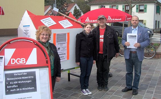 28 Wohnungen in Hirschhorn betroffen (Foto: privat)(bro) (str) Mit einer mobilen Straßenaktion in der Innenstadt informierte der DGB-Ortsverband Hirschhorn über den drohenden Verkauf des Wohnungsunternehmens „Nassauische Heimstätte“ durch die schwarz-gelbe hessische Landesregierung. Betroffen sind 146.000 Mieterinnen und Mieter in 61.600 Wohnungen, davon 28 in Hirschhorn. Mit der Aktion unterstützt der DGB Hirschhorn eine landesweite Protestkampagne des DGB Hessen und des hessischen Mieterschutzbundes.