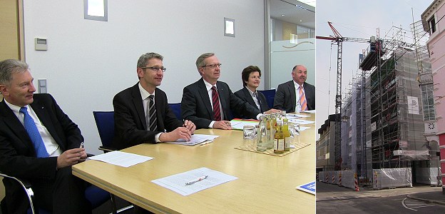 Stabilität und Wachstum in einem turbulenten Jahr V.l. Günter Apeltauer, Ralf Gallion, Ekkehard Saueressig, Ulrike Winterbauer und Kurt Vogt. Rechts die eingerüstete Volksbank-Hauptstelle in Eberbach, die derzeit energetisch saniert wird. (Fotos: Hubert Richter)(hr) Zufrieden zeigte sich der Vorstand der Volksbank Neckartal eG gestern bei der Vorstellung der Jahresbilanz 2011.